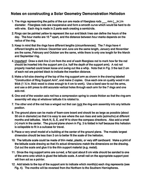 This heliodon must be constructed, since it is not commercially available. Because it is somewhat delicate, it may be necessary to store it when not in use. Because of its small size it cannot be used to test models and the number of people watching a demonstration is limited.
