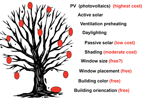 Solar has become almost synonymous with solar cells (PV), which is unfortunate because PV is the high hanging fruit and it makes sense to pick the low hanging fruit first. The free and easy strategies should be used before the expensive and difficult ones.