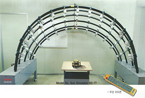 The Sun Simulator heliodon is conceptually clear because it imitates our everyday experience of the sun passing across the sky-dome, and the model being fixed on a horizontal ground plane. It is a large device usually greater than 10 ft (3 m) in diameter that cannot be easily moved. Although it is built for a particular latitude, the model support table can be tilted plus or minus 5 degrees yielding a 10 degree latitude range without loss of clarity (i.e. the architectural model is essentially still horizontal). Because of annual symmetry, only seven arches are needed to simulate the 21st day of all 12 months. For example, only one arch is needed to define the sunpaths for both November 21 and January 21. The Sun Simulator has a light for each hour of daylight for each month. The switches that control these lights can be located on a control panel, in a wired remote control, or a wireless remote control.