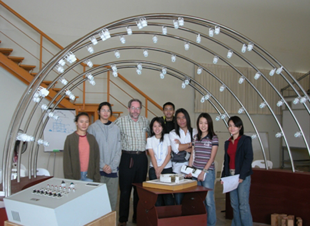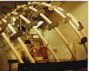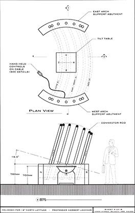 The Sun Simulator’s large size is also its greatest disadvantage. Significant building space must be allocated for its use. For a 10 ft (3 m) heliodon a floor area of 15 x 15 ft (4.5 m) is required, and still larger heliodons are better. However, it is ideal for a public space such as a lobby if the space can be dimmed when necessary. In such a space, the heliodon acts as both a piece of sculpture as well as a teaching tool. It teaches the most important aspects of solar geometry even when its lights are not on. The Sun Simulator heliodon must be built locally from free CAD drawings available through this webpage.